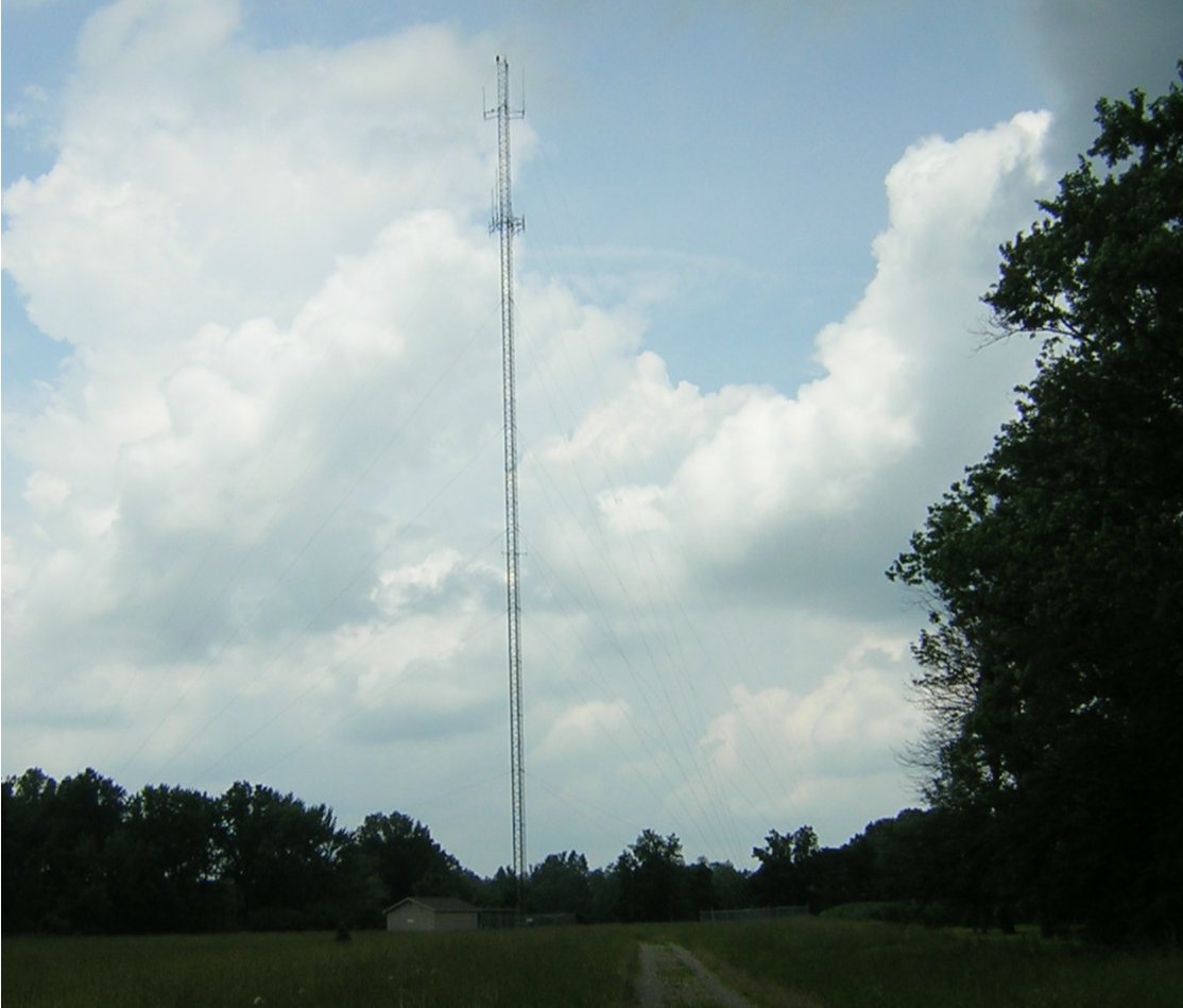 The antenna is at 340 feet. The antennas are fed with 1 1/2″ heliax up the 344 foot tower.
